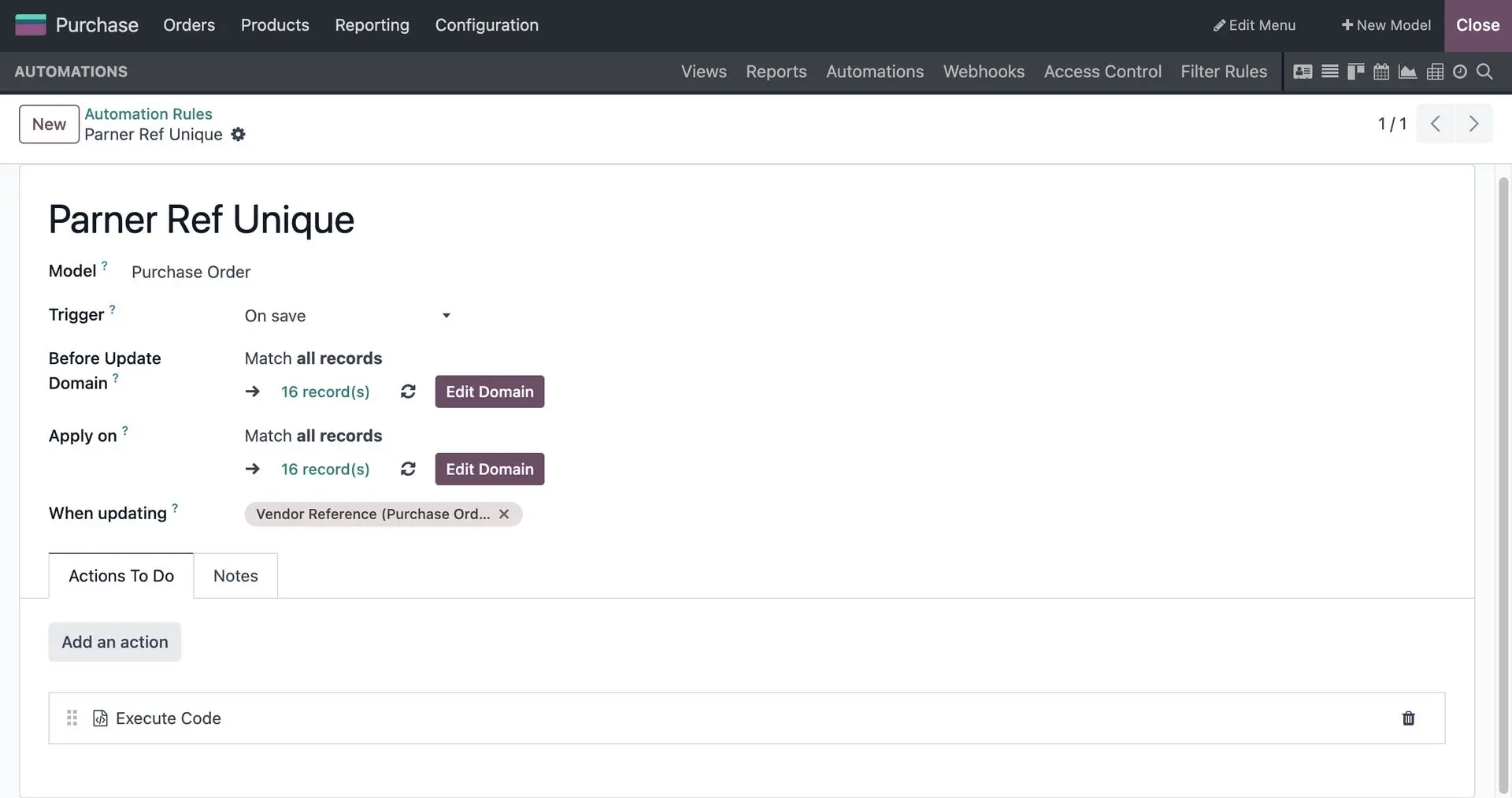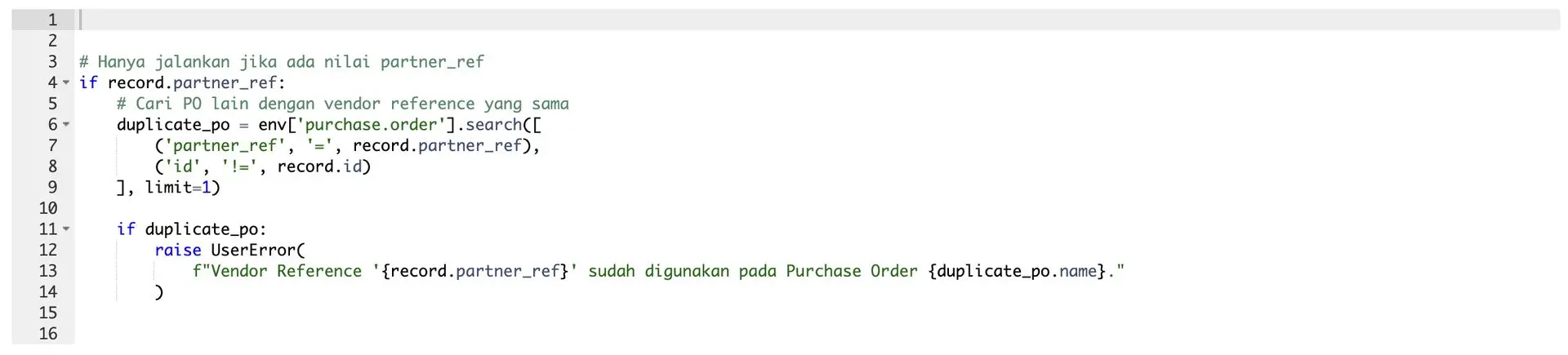 Untungnya, dengan Odoo Studio, Anda bisa menambahkan validasi sederhana untuk mencegah duplikasi Vendor Reference tanpa perlu mengubah kode Python di backend.