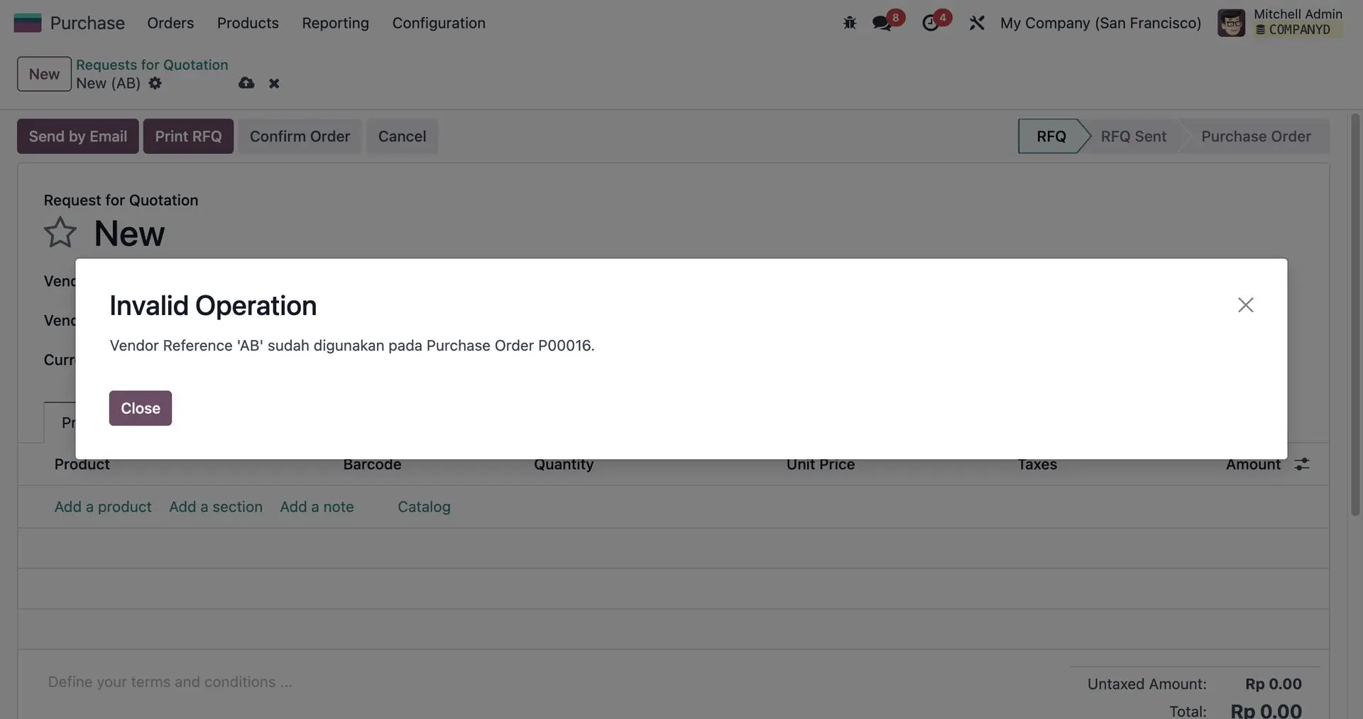⚠️ Vendor Reference 'ABC123' sudah digunakan di Purchase Order PO0007. Harap gunakan referensi lain.