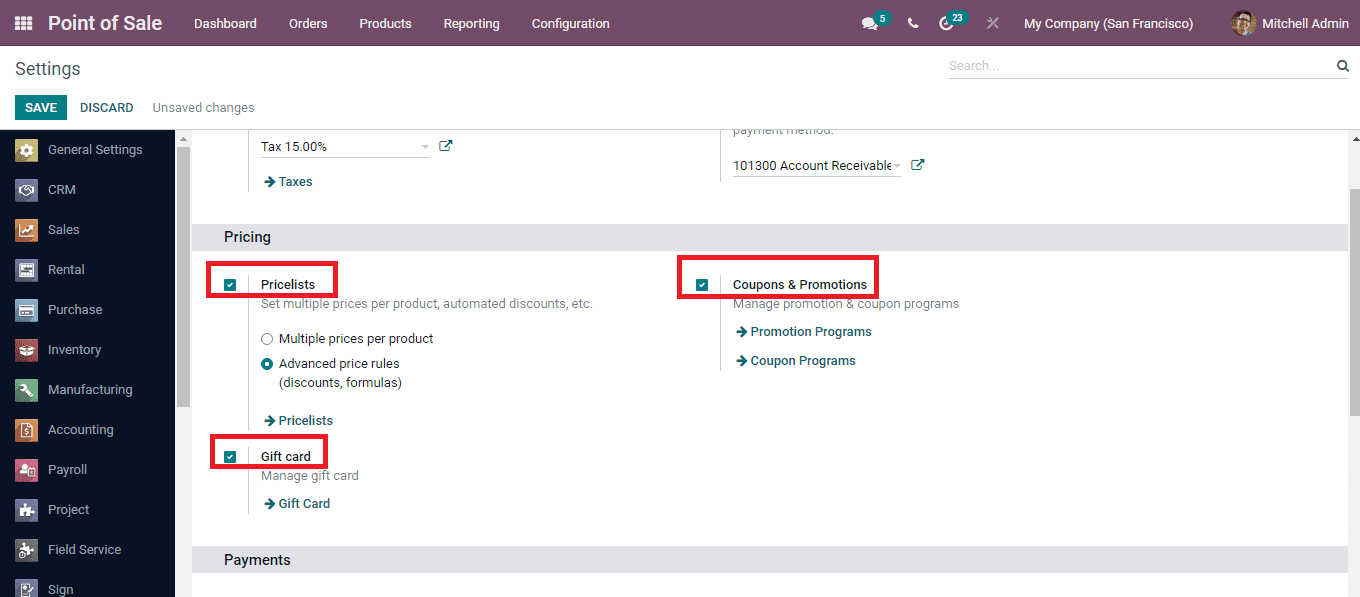 Selain itu, fitur Coupons & Promotions dapat diaktifkan dengan mencentang opsi Coupons & Promotions, sehingga perusahaan dapat menjalankan program diskon, voucher, dan promosi pemasaran langsung melalui Point of Sale.